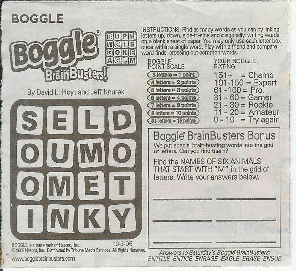 Generalize the word-search program in Chapter 10 to allow any adjacent letters (not simply those in a straight line) to be used to form a word. Thus in Figure 10.1 (on page 349), goat (starting at row 3, column 1) is now a valid word, but gag (which would reuse the g) is not. This is essentially Boggle, a popular board game. Each day, the Miami Herald has a Boggle game. The Boggle game for Monday, October 3 is shown below. It contains such words as monkey, mule, and mouse